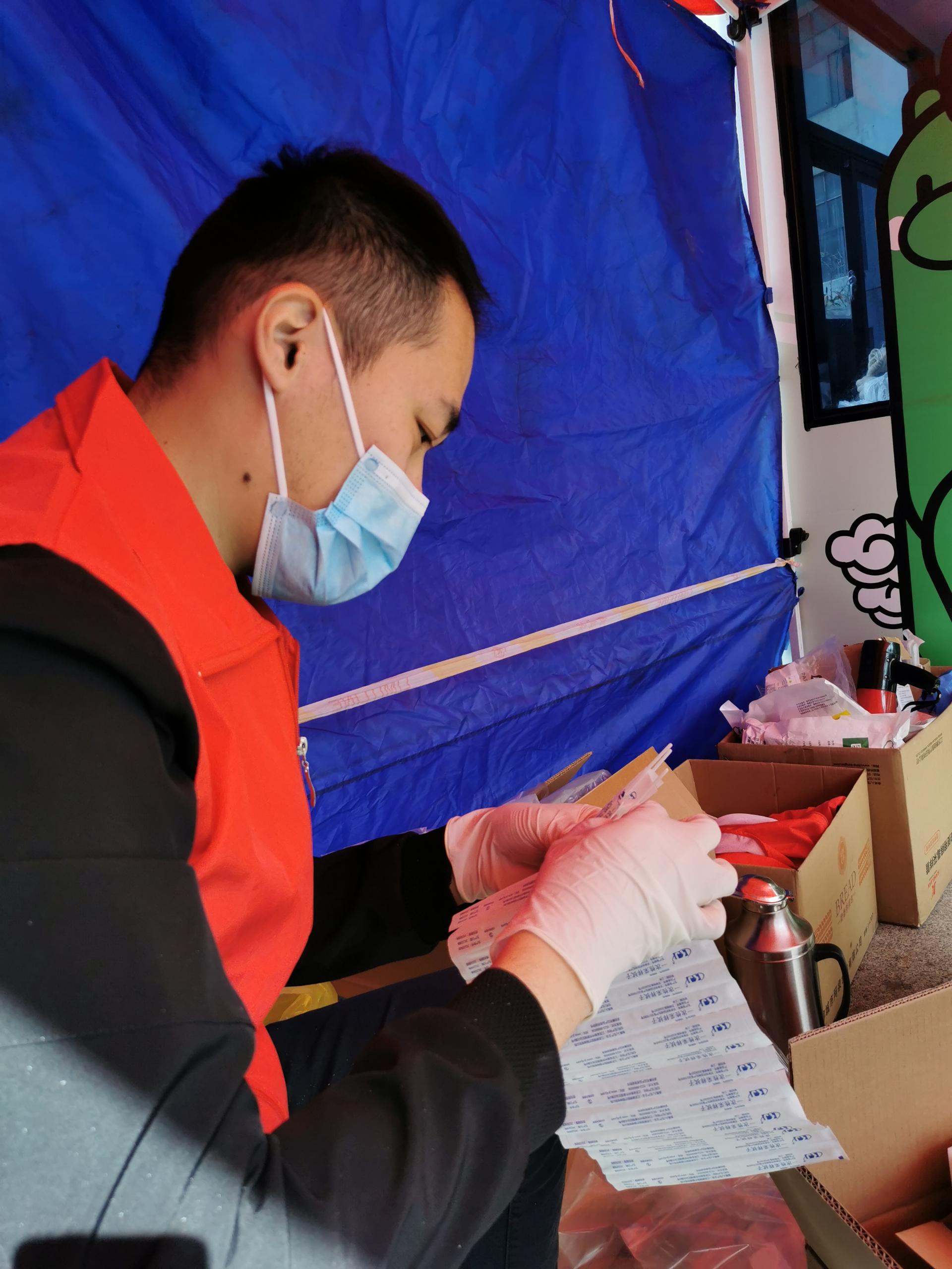 在薛家島街道青云山路社區(qū)服務(wù)的黨員孫建強(qiáng),沖在一線、干在一線,協(xié)助社區(qū)開展核酸檢測(cè)工作。據(jù)孫建強(qiáng)介紹,他負(fù)責(zé)一次性檢測(cè)棒的拆裝工作,拆開檢測(cè)棒,交給采樣工作人員。一邊拆,一邊監(jiān)測(cè),流水線作業(yè),提高檢測(cè)效率。這樣一項(xiàng)看上去很簡(jiǎn)單的工作,孫建強(qiáng)一做就是兩三個(gè)小時(shí)。